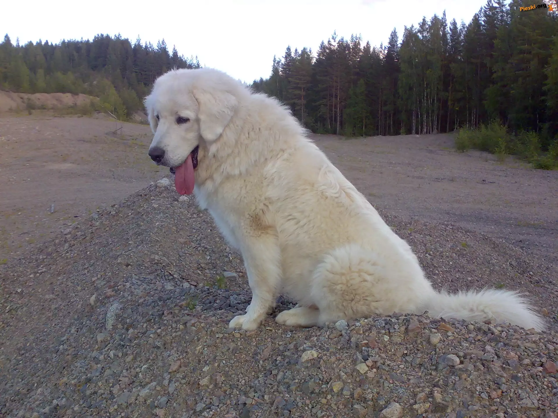czerwona, Owczarek podhalański, zęby, obroża Mordka, Polskiego owczarka podhalańskiego Biały, mały, piesek Biały, Polski owczarek podhalański, język Owczarek podhalański, zielona, trawa Trawa, Dwa, Pieski, Niebo Pies, Owczarek Podhalański skórzana, Głowa, Owczarka podhalańskiego, obroża