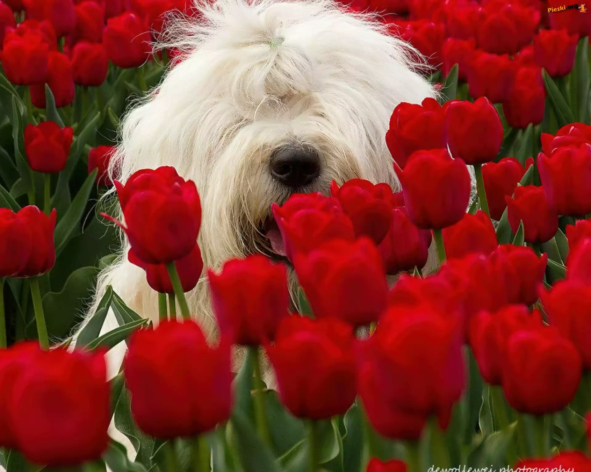 Tulipany, Pies, Biały, Czerwone, Maltańczyk, Pieski