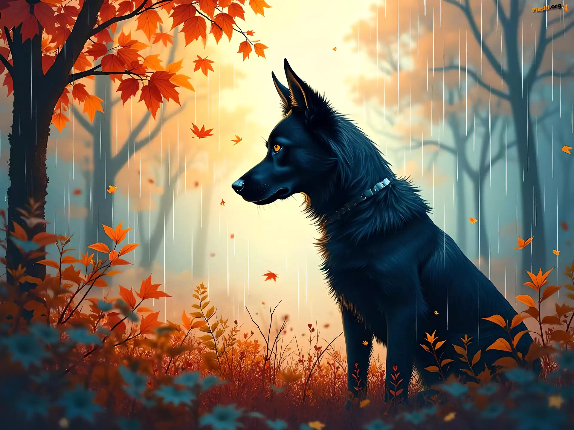Grafika, Pies, Jesień, Deszcz, Czarny, Las, Drzewa