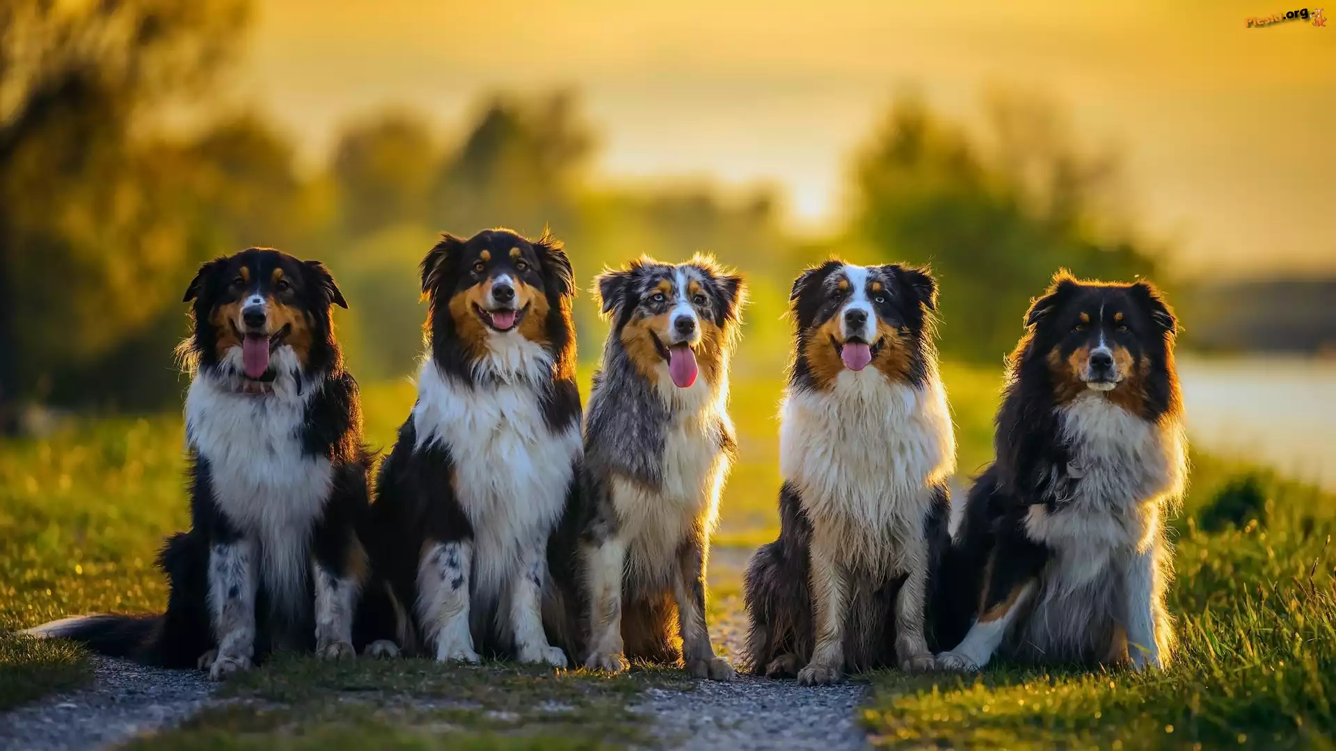 Psy, Droga, Owczarki australijskie, Kwintet, Pięć, Trawa, Pieski