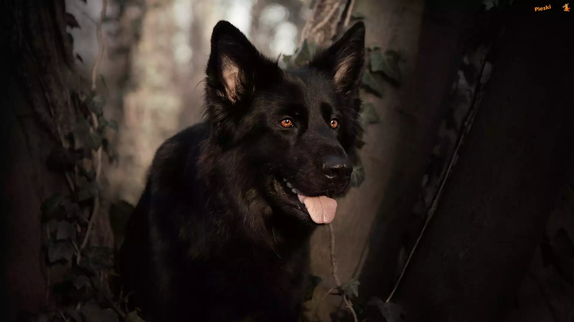 Pies, Drzewa, Język, Czarny owczarek niemiecki, Mordka, Rośliny, Pieski