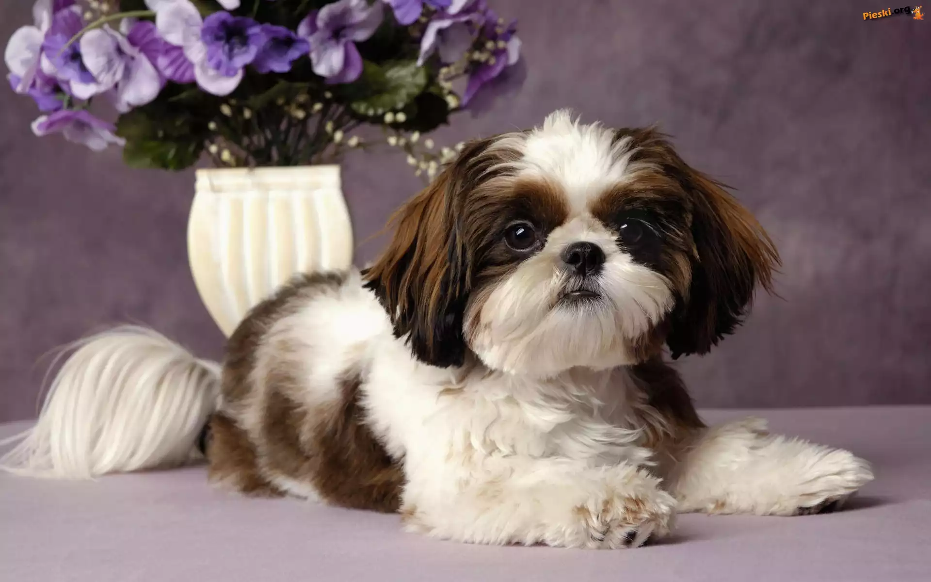 Fioletowe, Piesek, Spaniel Japoński, Kwiatuszki, Pieski