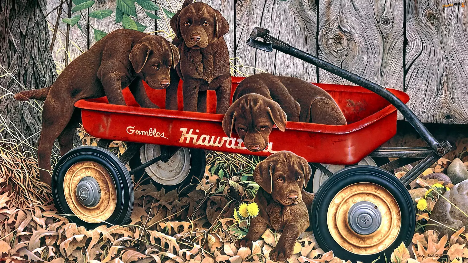 Jesień, Cztery, Malarstwo, Brązowe, Ogród, Szczeniaki, Psy, Przyczepa, Jerry Gadamus