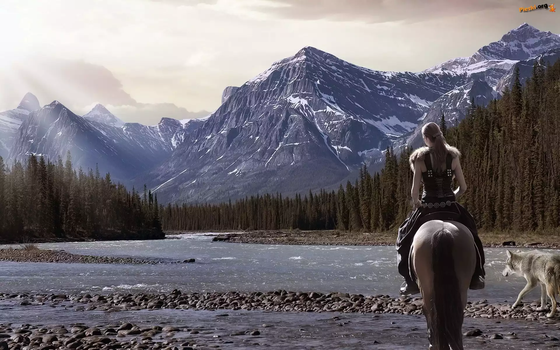 Kobieta, Góry, Rzeka, Koń, Pies, Lasy