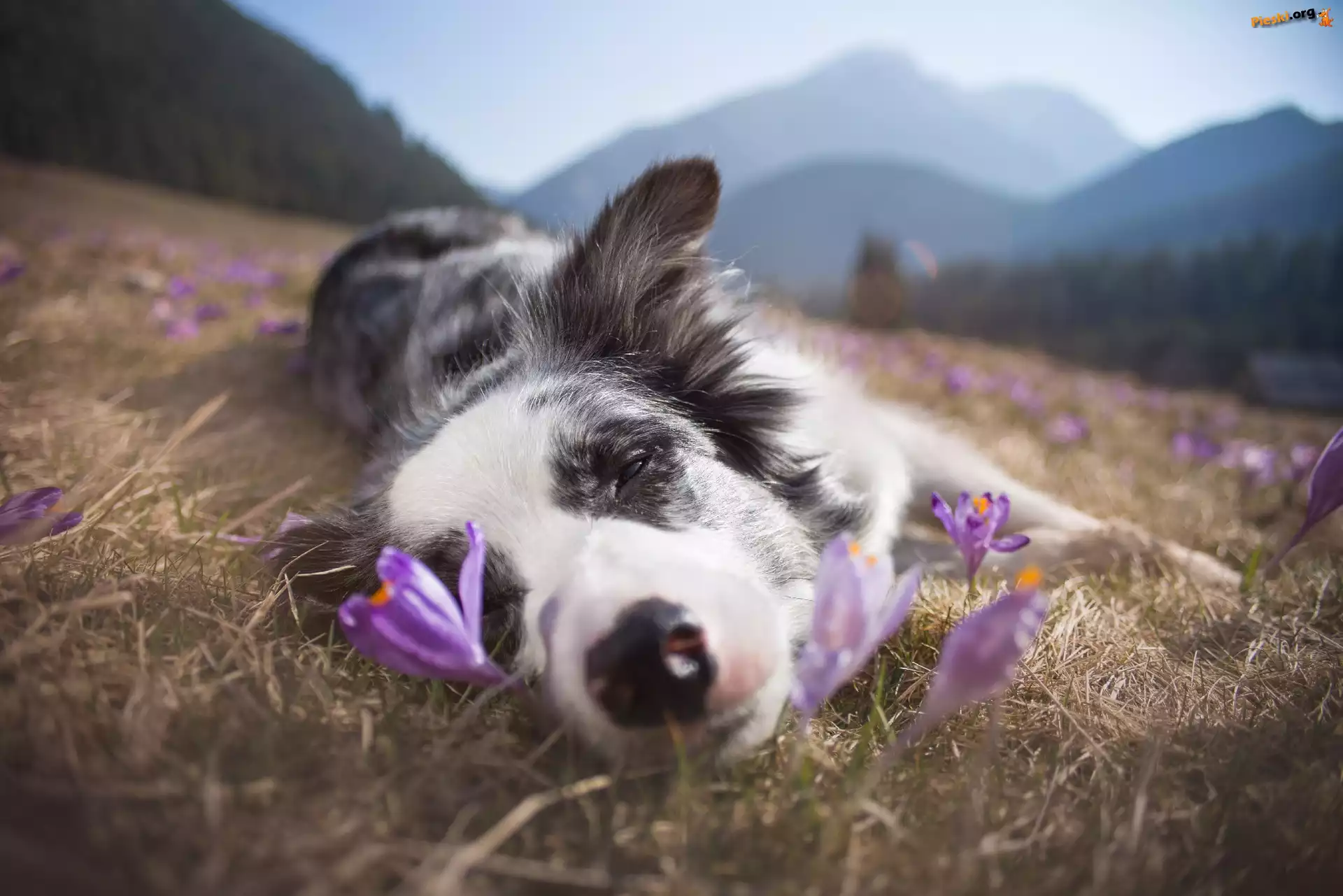 Spiący, Krokusy, Trawa, Border collie, Łąka, Góry
