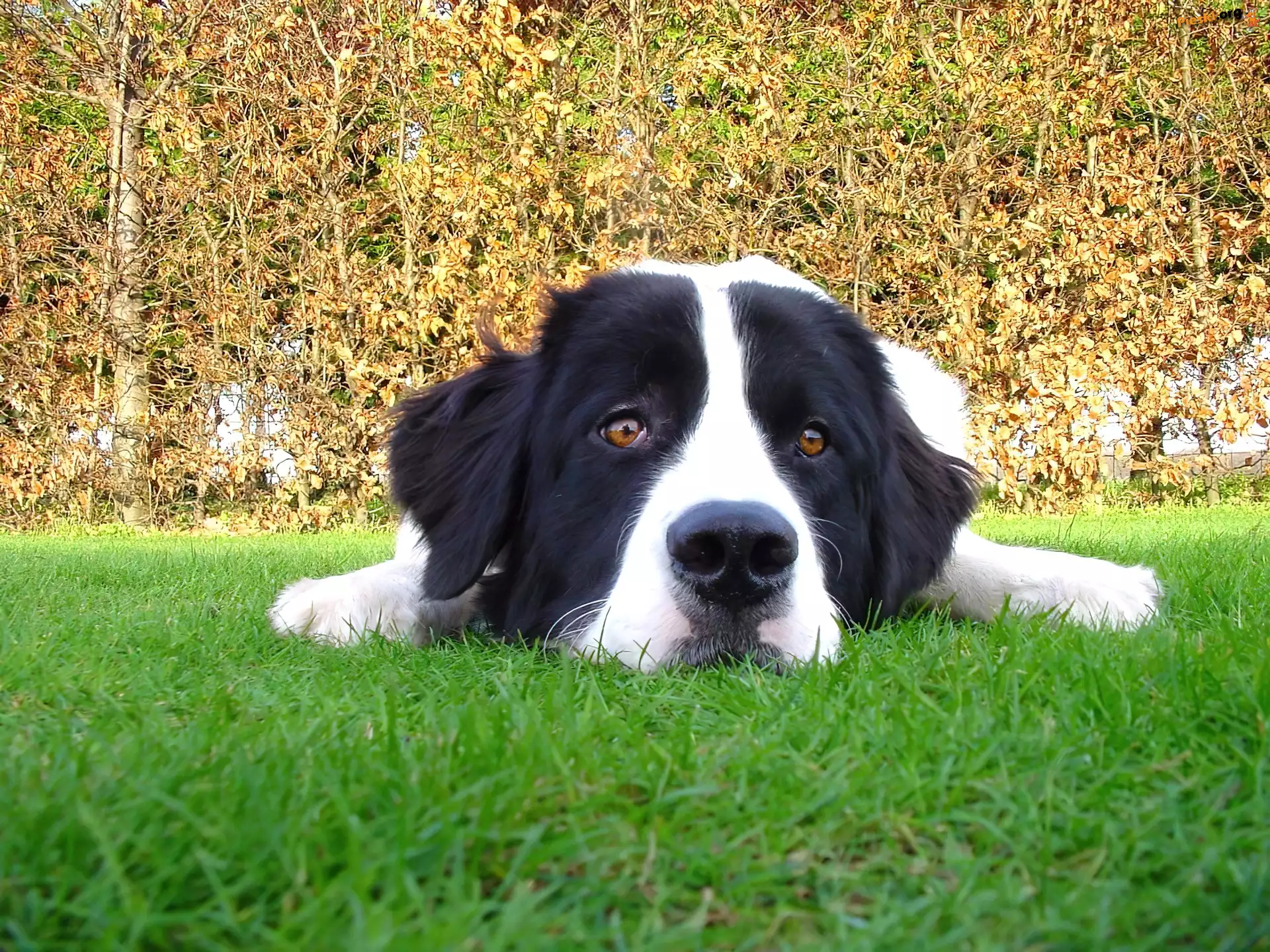 trawa, zielona, Landseer morda, Landseera pysk, Landseera biało-czarny, Landseer Morda, Landseera słodkie, szczeniaki, Landseery biegnący, Landseer Piesek, Łąka mordka, Landseera trzy, Landseery kratka, chustki, Landseer Kot, Pies, Słodkie