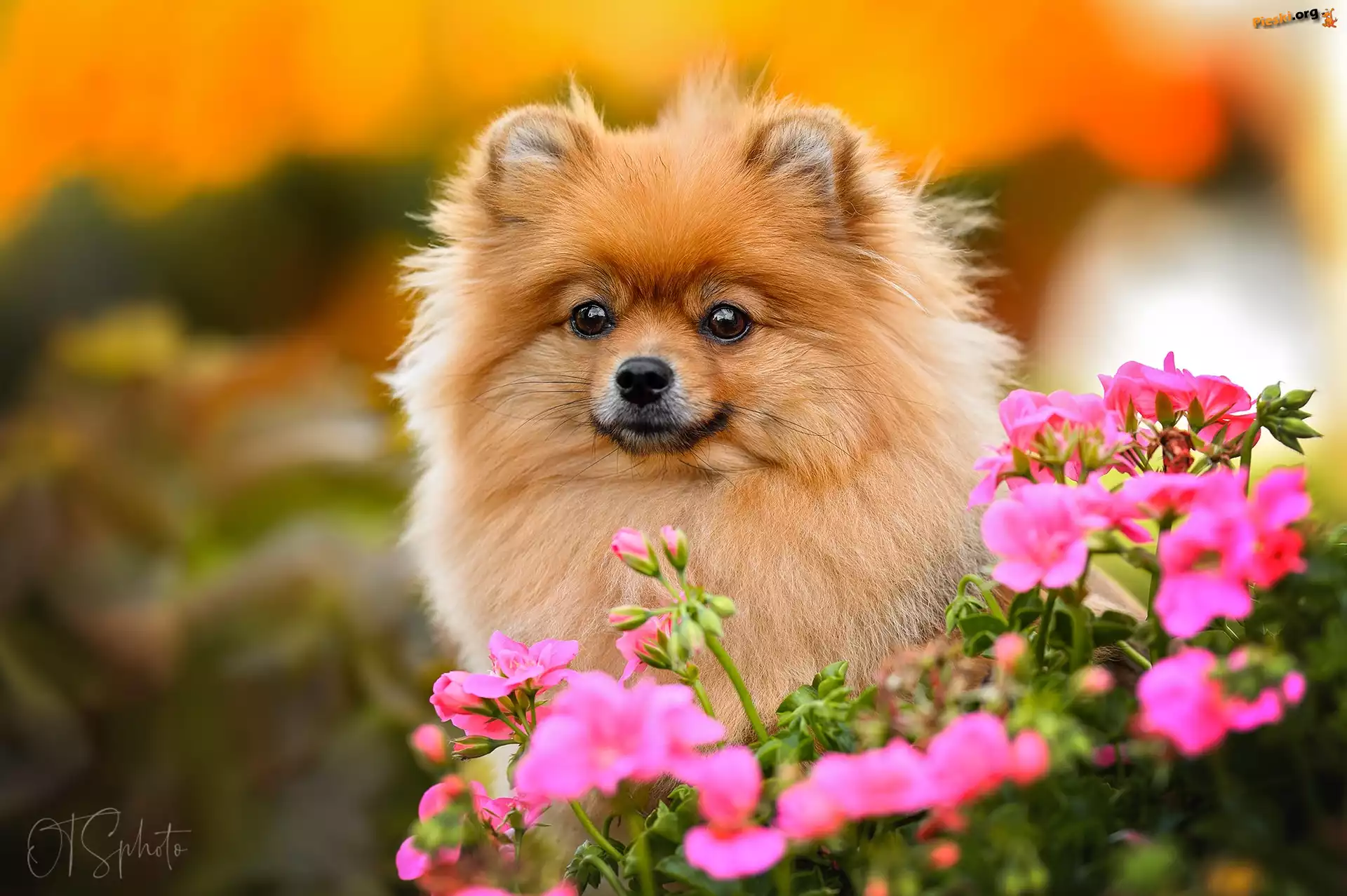 Pomeranian, Kwiaty, Pies, Mordka, Szpic miniaturowy