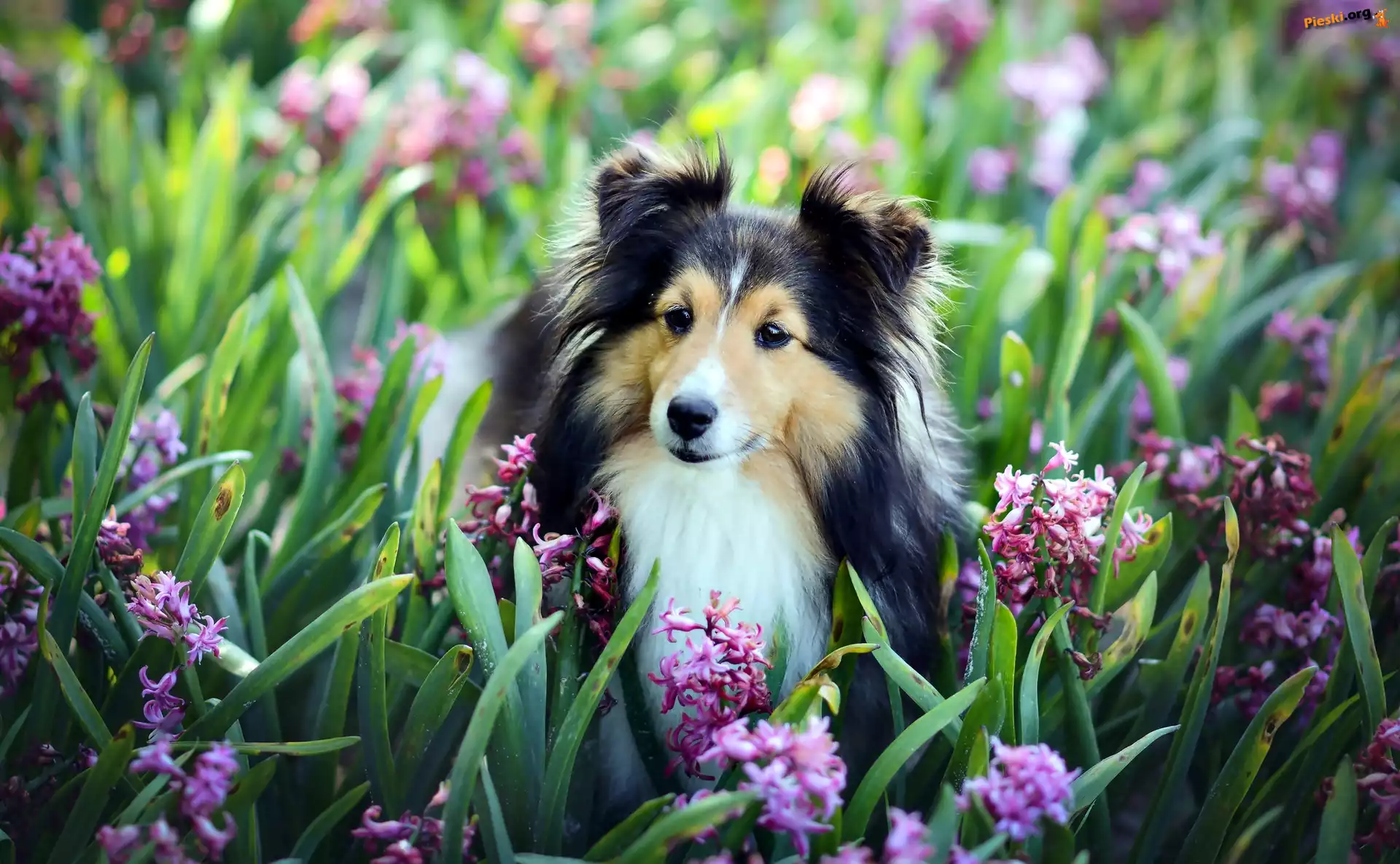 Owczarek szetlandzki, Kwiaty, Hiacynty, Pieski
