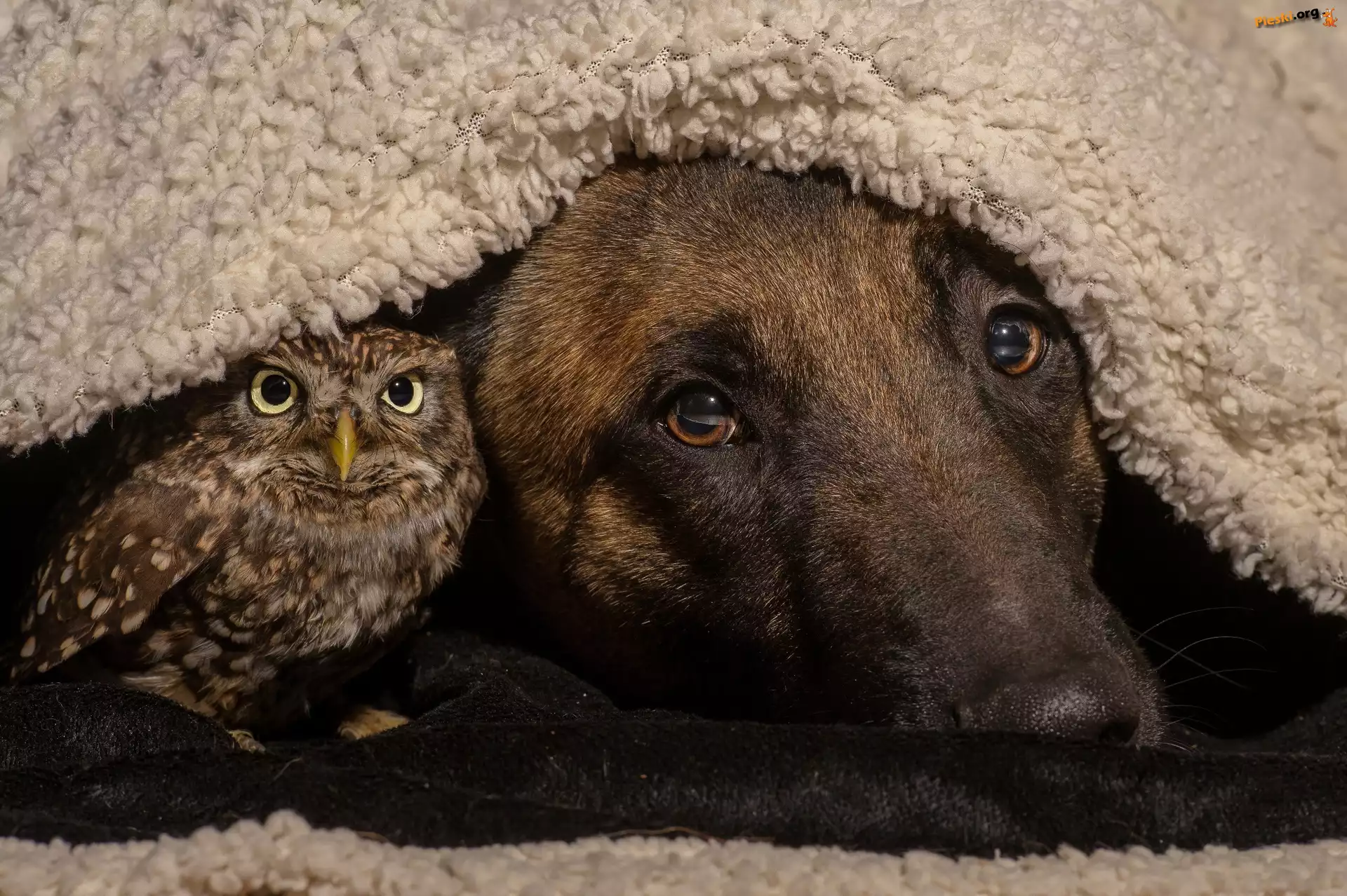 Owczarek niemiecki, sowa, koc, Pieski