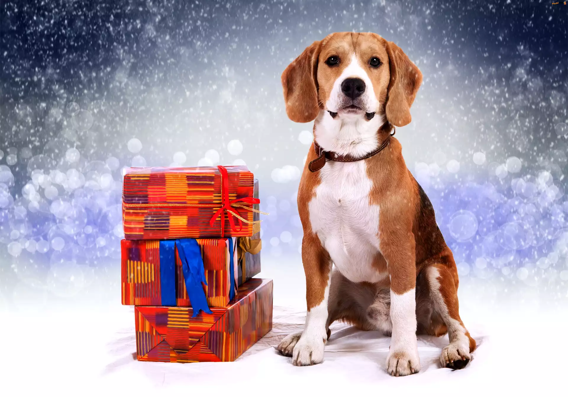Padający, Beagle, Prezenty, Śnieg, Pieski