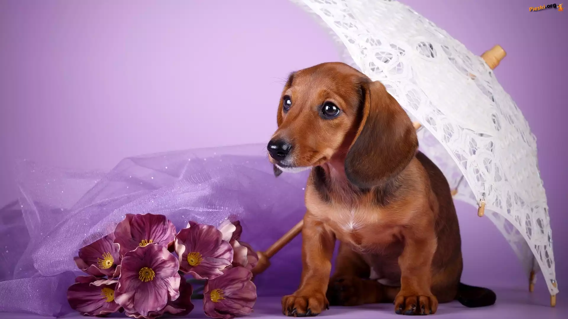 Parasolka, Pies, Jamnik krótkowłosy, Kwiaty, Pieski
