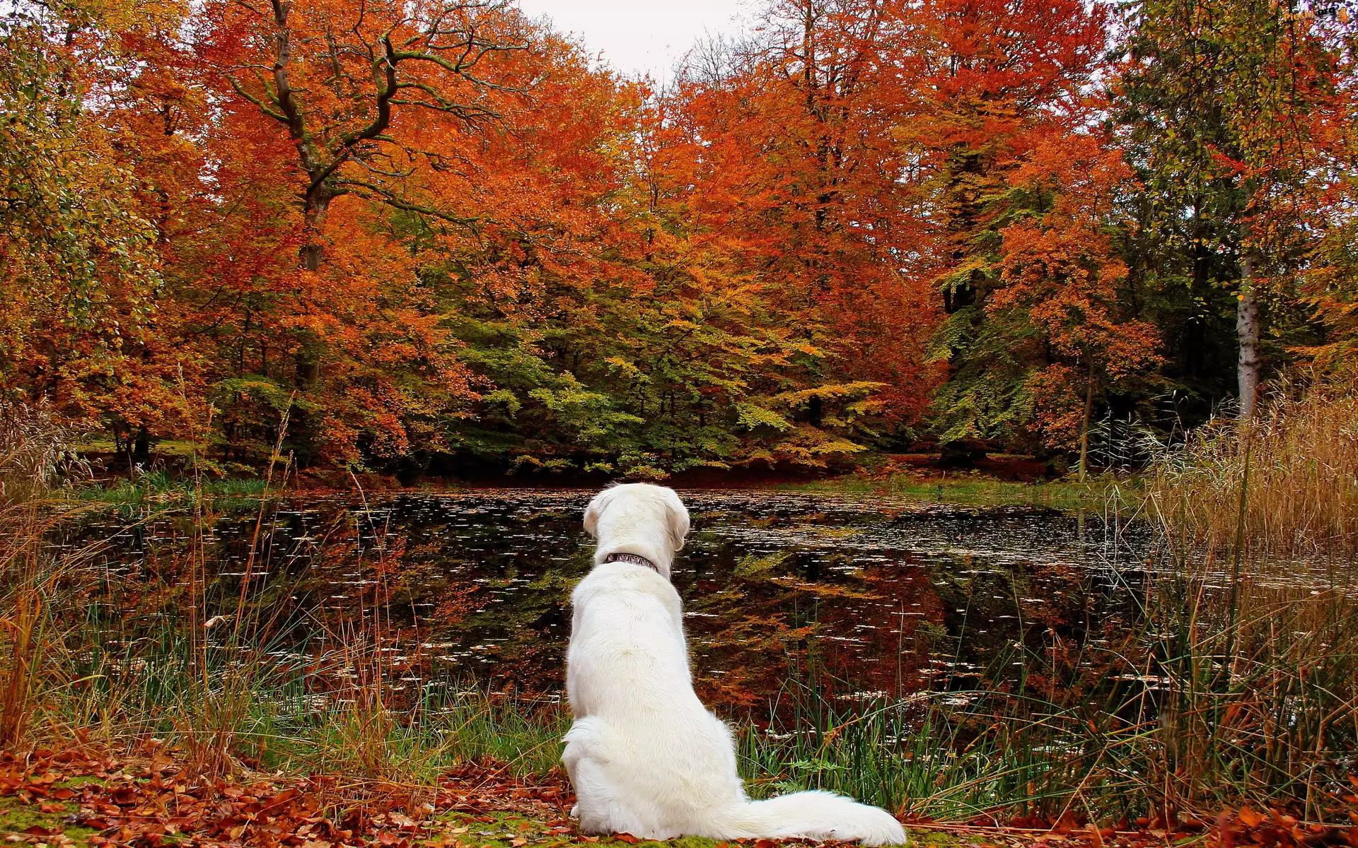Park, Liście, Wodny, Pies, Zbiornik, Jesień