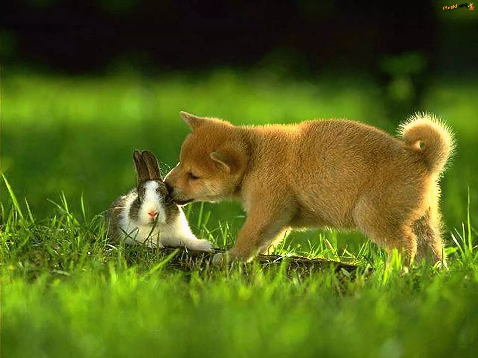 Trawa, Królik, Pies, Akita, Pieski