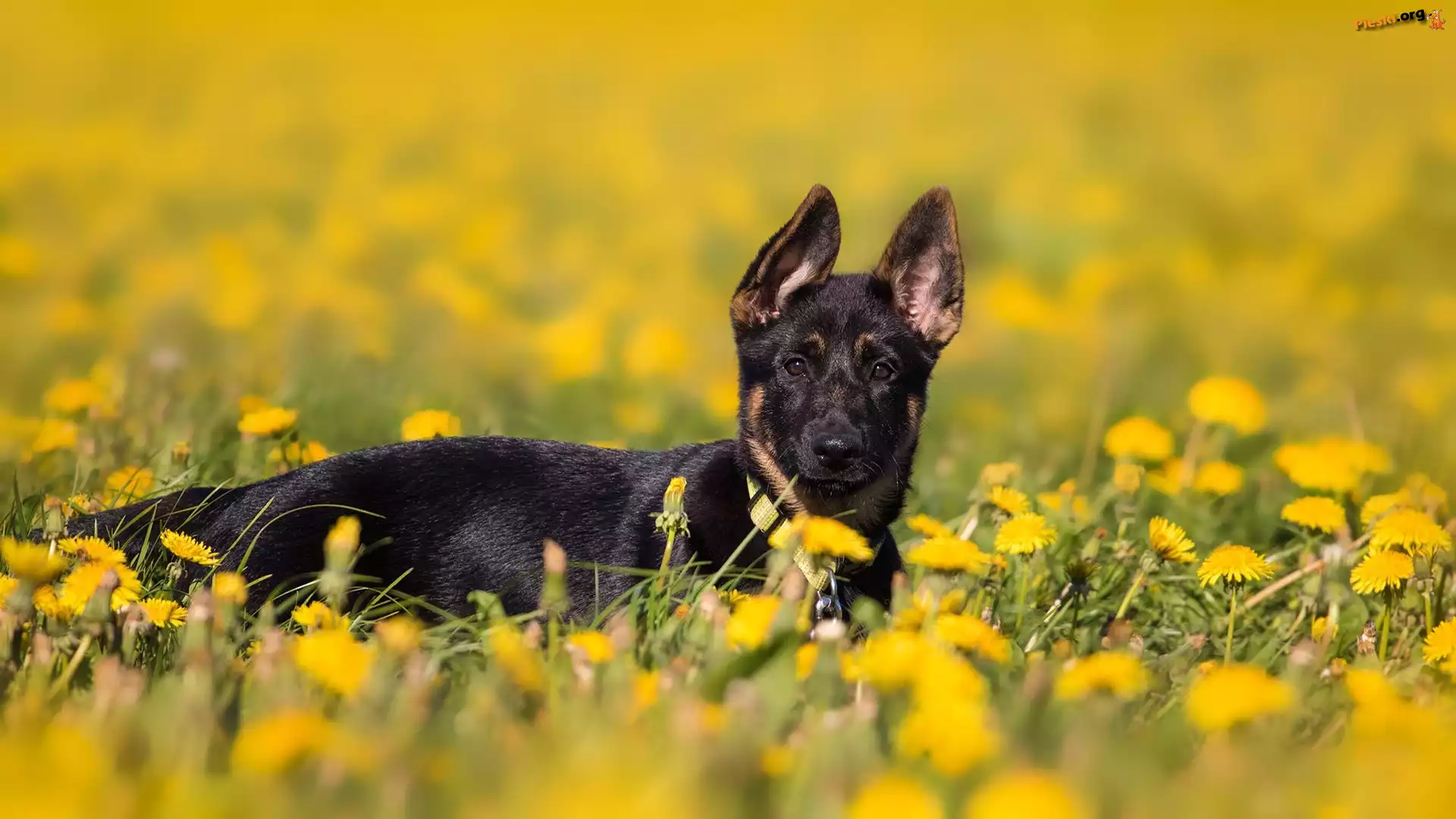 Szczeniak, Rozmyte, Mniszek pospolity, Owczarek niemiecki, Łąka, Tło, Pieski