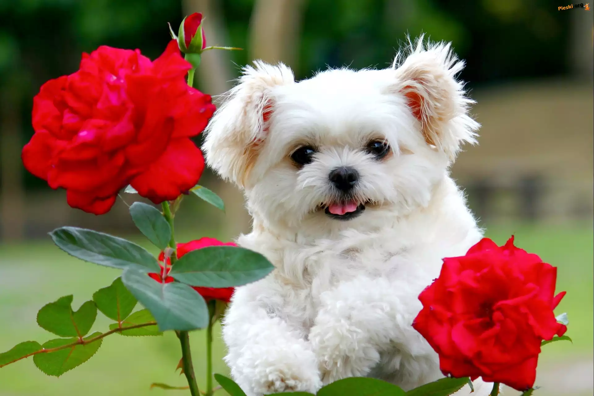 Biały, Szczeniaczek, Róże, Pieski