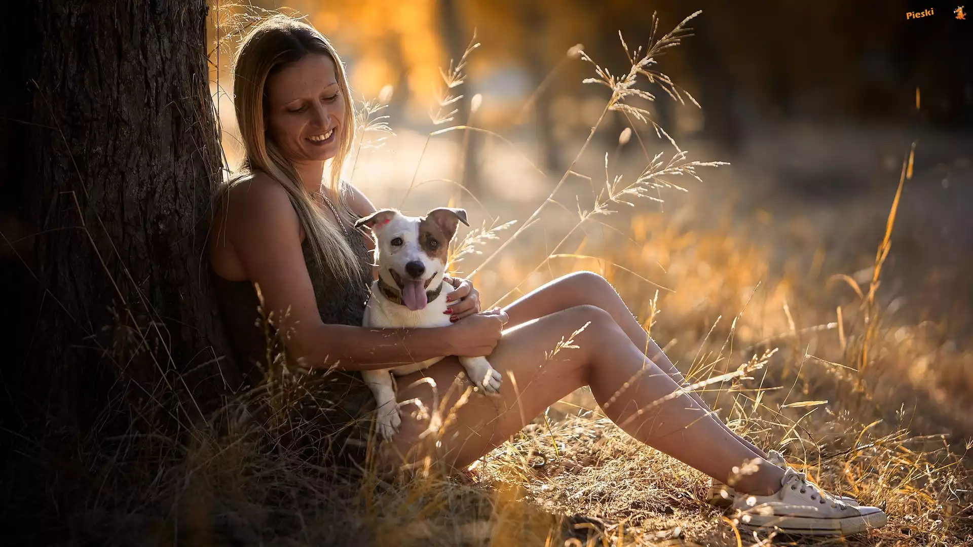 Trawa, Pies, Kobieta, Drzewo, Słońce