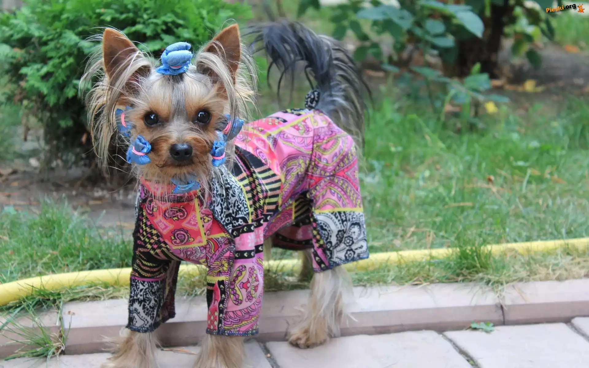 Czerwone, York, Miniaturka, Róże Mordka, Yorka, Języczek Psy, York, Ubranka Pies, Yorkshire Terrier, Róża Śmieszne, Pies, Ubranie, Trawa