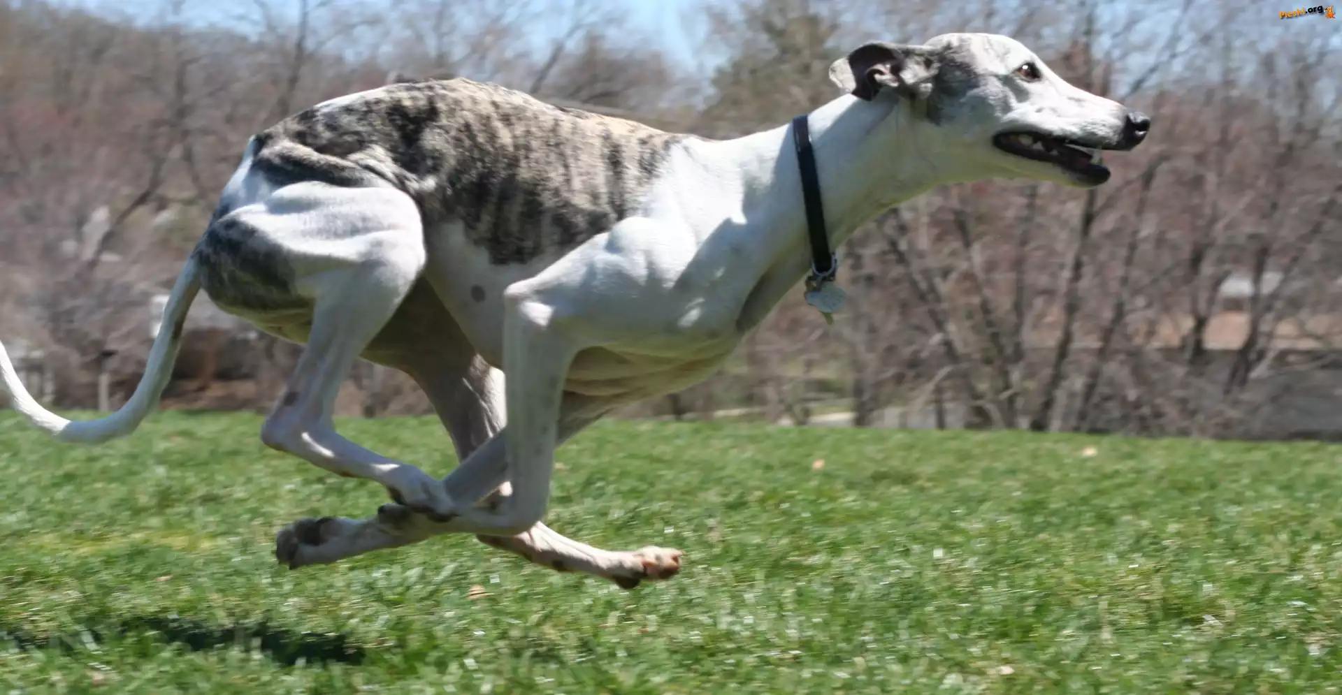 Whippet Whippet, zielona, trawa Whippet, zielone, liście Whippet, różowe, ubranko Mordka, Pies, Whippet, Liście