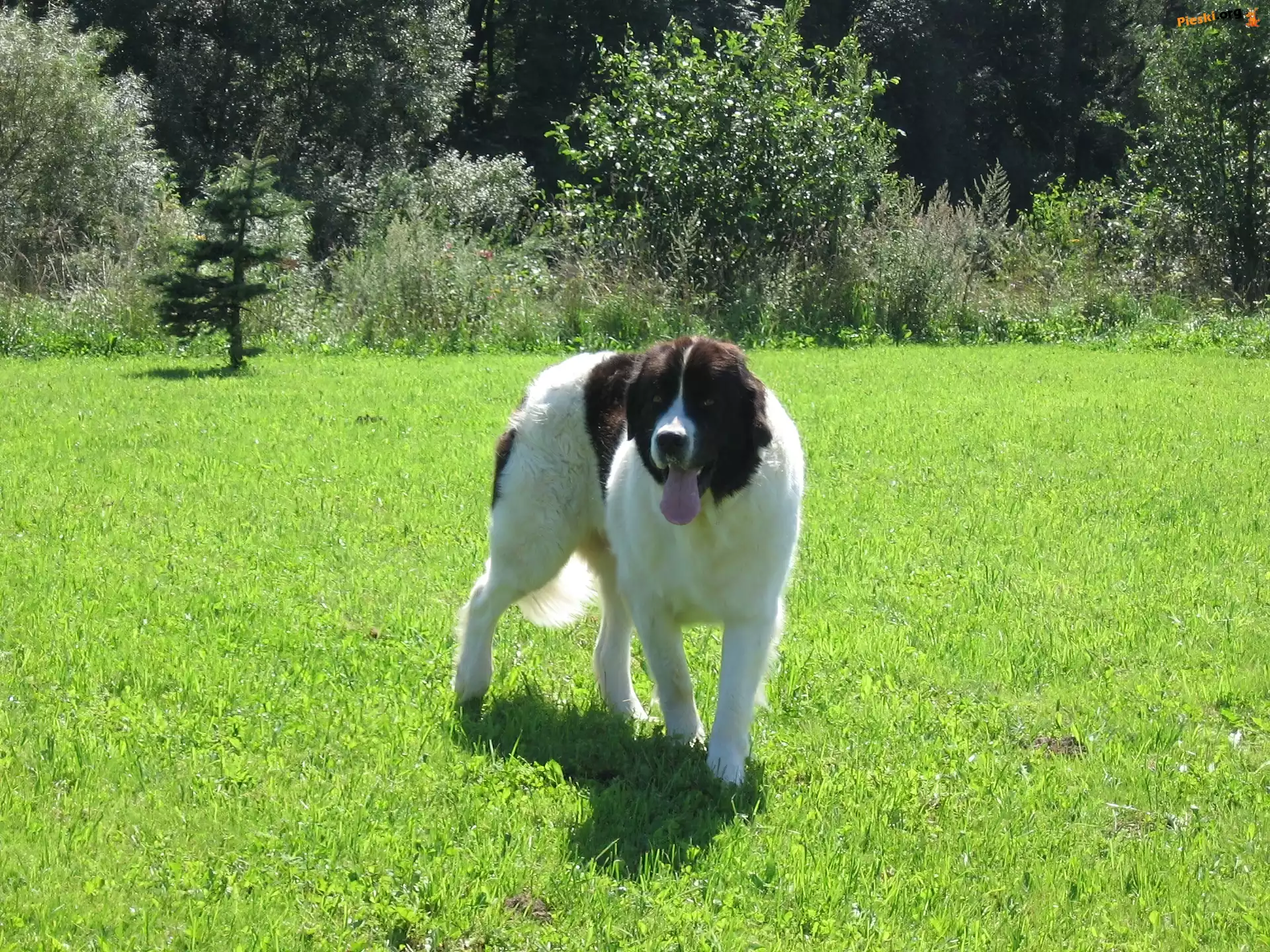 trawa, zielona, Landseer morda, Landseera pysk, Landseera biało-czarny, Landseer Morda, Landseera słodkie, szczeniaki, Landseery biegnący, Landseer Piesek, Łąka mordka, Landseera trzy, Landseery kratka, chustki, Landseer Kot, Pies, Słodkie